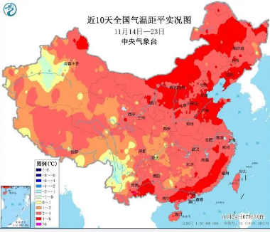 据中央气象台网站消息,11月中旬以来,一直没有强冷空气影响我国,气象数据监测显示,过去10天,全国大部地区气温较常年同期偏高2~4℃,部分地区偏高4~6℃。预计26-30日,寒潮天气将横扫我国,大部地区气温暴跌,寒潮影响后大部地区气温将转为较常年明显偏低,天气寒冷。此次寒潮不仅影响范围广、降温剧烈、风力大,还将伴有雨雪天气,公众需提前关注天气变化。