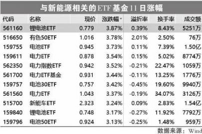 受此影响,10月11日,创业板指高开后震荡,盘中一度涨超1.6%,与锂电等动力电池相关的板块表现强劲。场内基金中,锂电、电池、新能源汽车、碳中和等相关指数的ETF上涨明显。数据显示,14只ETF涨幅超过3%,包括富国中证电池主题ETF、华夏中证细分有色金属产业ETF、广发国证新能源车电池ETF、广发中证全指电力公用事业ETF、银华中证全指电力公用事业ETF等,涨幅为3.87%、3.78%、3.73%、3.54%、3.52%。