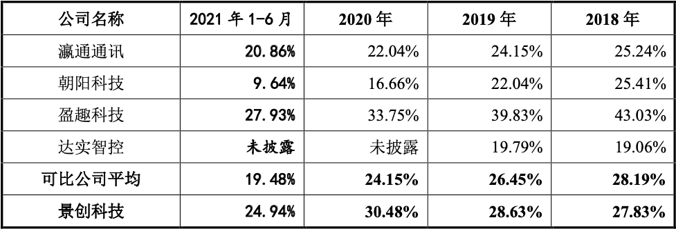报告期内,从毛利率表现来看,景创科技均高于其选择的同行业可比公司,且2018年-2020年,可比公司毛利率平均值为28.19%、26.45%、24.15%,逐期下滑,但景创科技毛利率分别为27.83%、28.63%、30.48%,反而逐年有所提升。