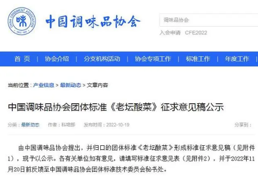 中国调味品协会近日公示了团体标准《老坛酸菜》征求意见稿,公示日期截至2022年11月20日。征求意见稿规定了老坛酸菜的术语和定义、技术要求、检验方法、检验规则及标签、包装、运输、贮存,适用于老坛酸菜的生产、检验和销售。