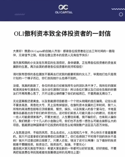 这家公司叫傲利资本,创始人名为齐洛,信的内容足以让人“三观震碎”,跟去年底同样官宣跑路的湖南盛大金禧如出一辙: