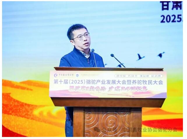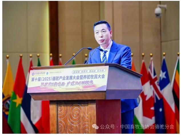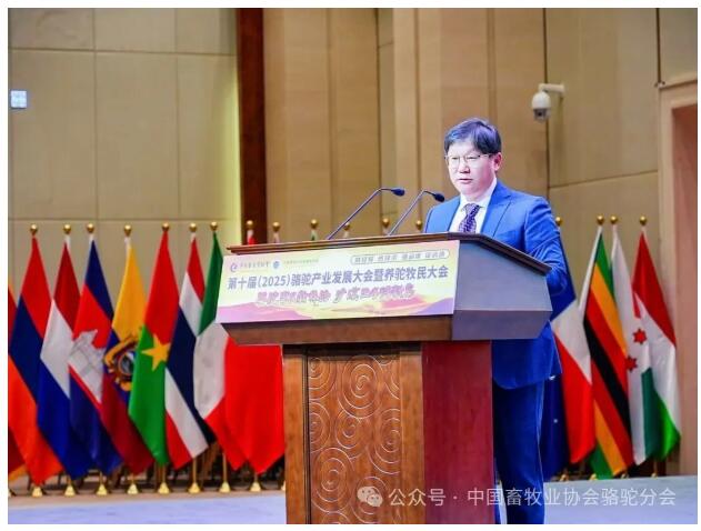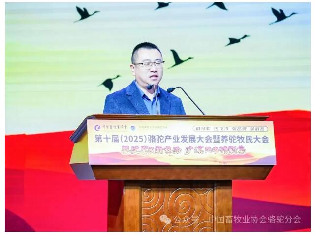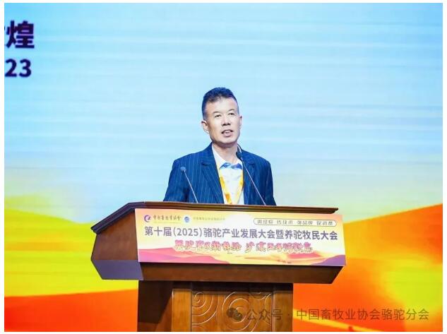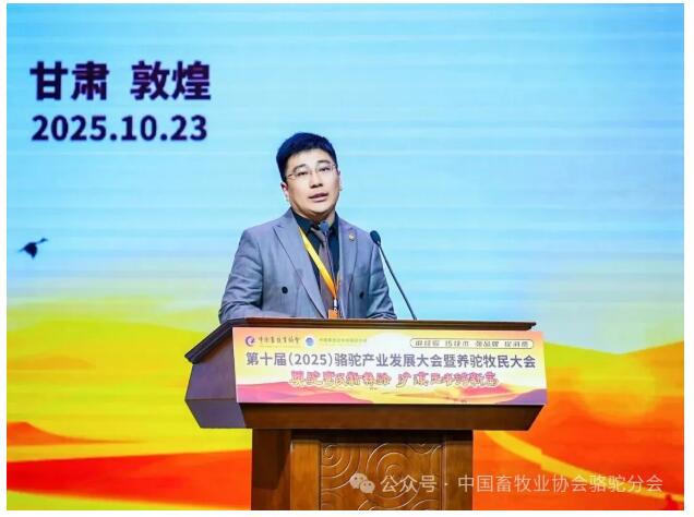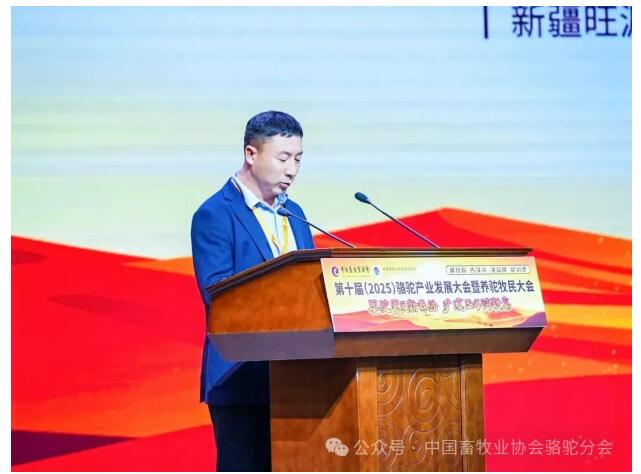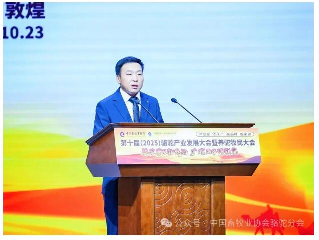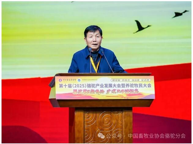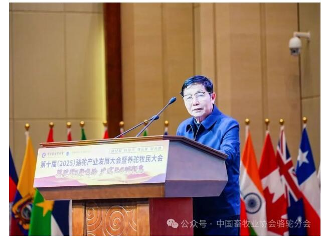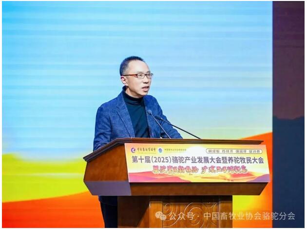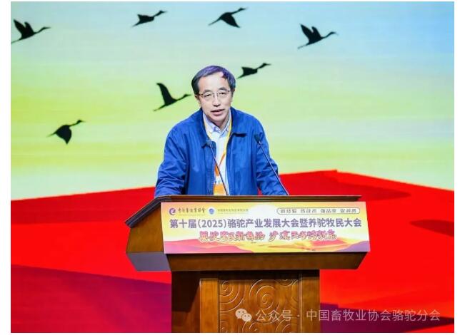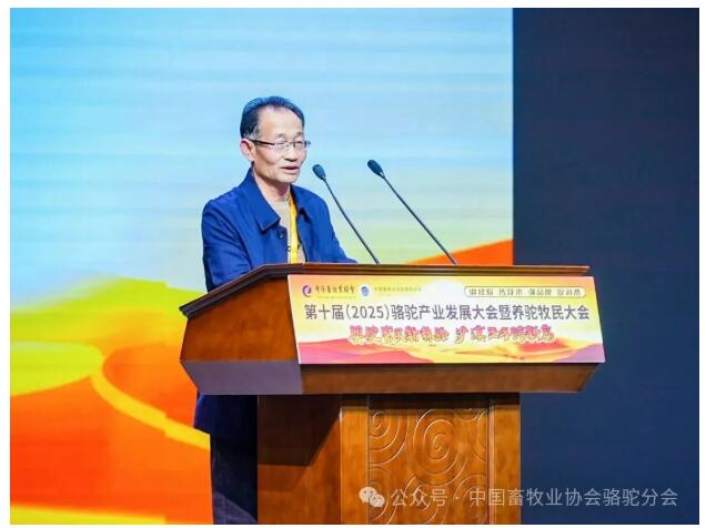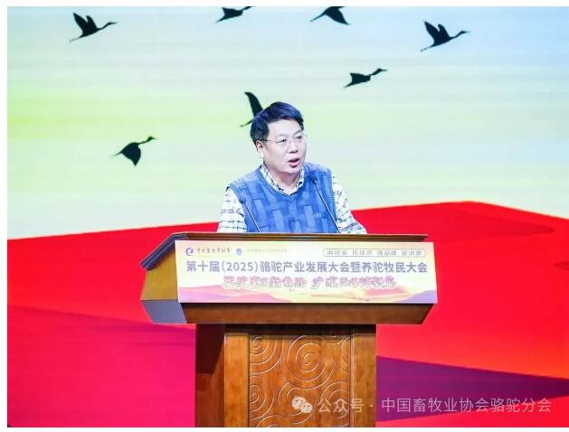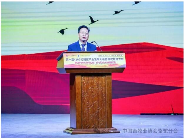 中国畜牧业协会会长蔡辉益致开幕辞。他表示:回顾骆驼产业发展历程,其已实现跨越式成长 —— 存栏量从 2009 年的 22 万峰增至如今的 58 万峰,产业链更延伸覆盖高端食品、生物医药、时尚服饰、特色文旅等多个领域,已成为边疆牧民增收致富的支柱产业。面对产业发展新阶段,他强调需聚焦 “科技驼业”“共富驼业”“人文驼业” 三大方向,推动产业实现三大升级:从“技术应用”走 “核心创造”,夯实自主创新竞争力;从“产业链”迈向“价值链”,让牧民更深度共享发展红利;从“卖产品”升级 “卖文化”,挖掘产业精神内涵、拓展价值边界。