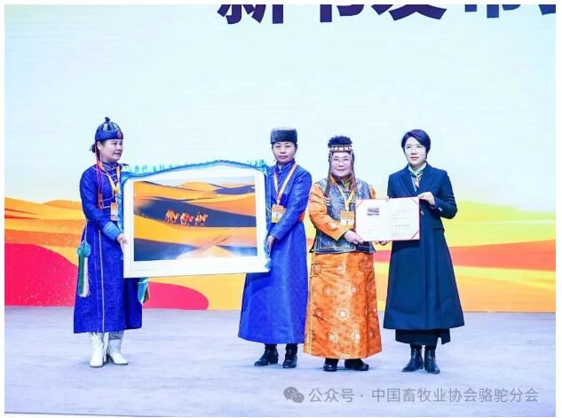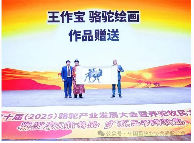 ▲十四五边疆牧区骆驼产业典型案例代表集体合影;北大访问学者,酒泉书画院院长,敦煌中国画研究院执行院长丁永明现场赠送“兴驼富民新丝路,沙漠王者谱新篇”主题字画,中国畜牧业协会会长蔡辉益接受画作。