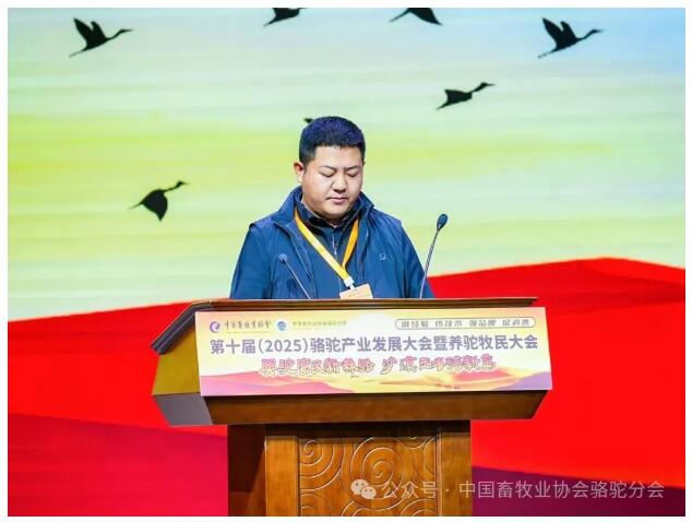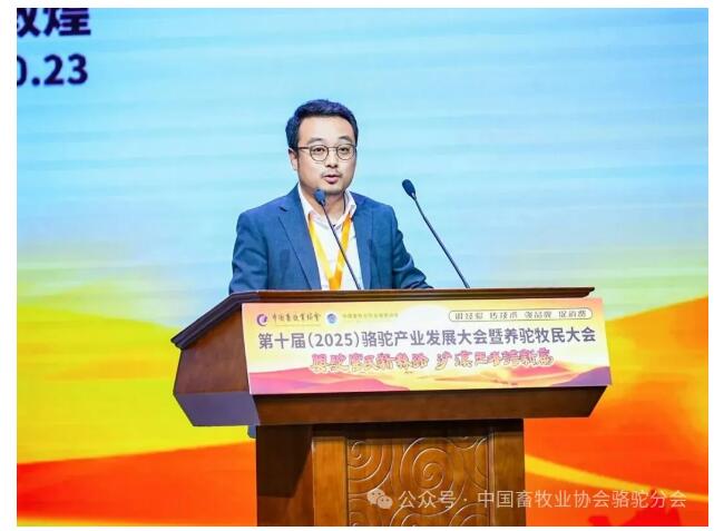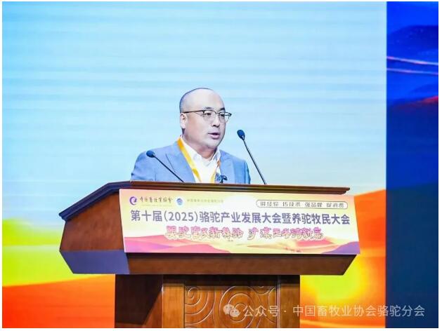 ▲金骆驼集团中国区董事长、内蒙古苏尼特驼业生物科技有限公司副董事长杨天一作题为《标准化筑基品牌化赋能骆驼产业协同发展》的报告。